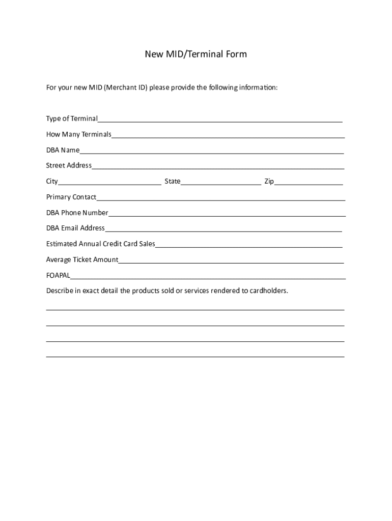 This form is used to apply for a new Merchant ID (MID) and to provide necessary details about the terminals and business operations.