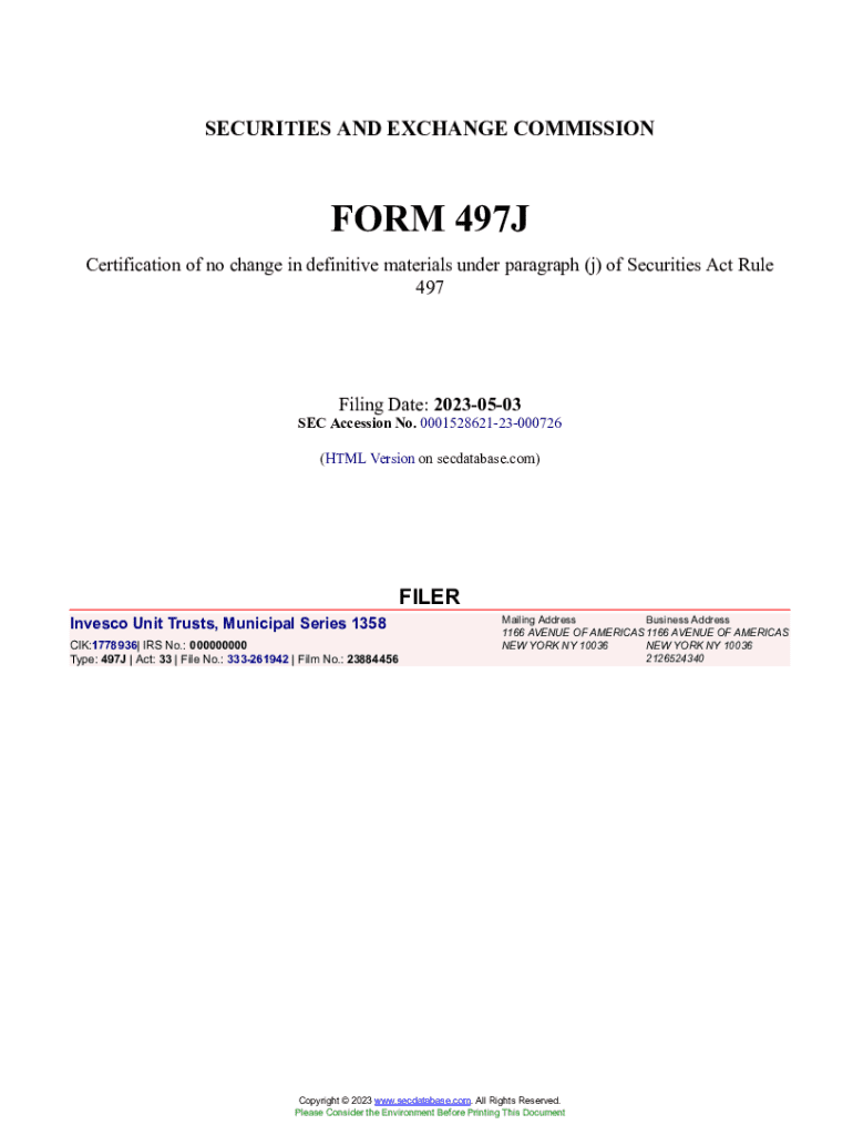 This document serves to certify that the most recent post-effective amendment to the registration statement for Invesco Unit Trusts, Municipal Series 1358 does not differ from the previously filed materials.
