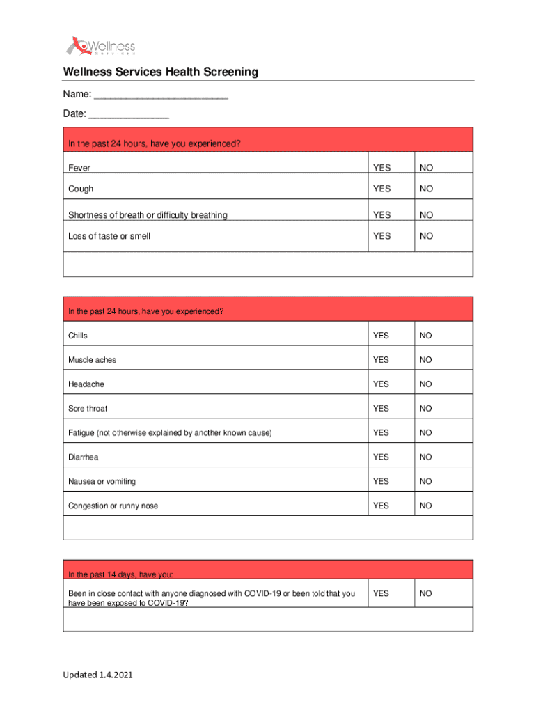 This form is designed to screen individuals for health-related symptoms and potential exposure to COVID-19 within the past 24 hours and 14 days. It assesses various symptoms and contact history to ensure safety and wellness.