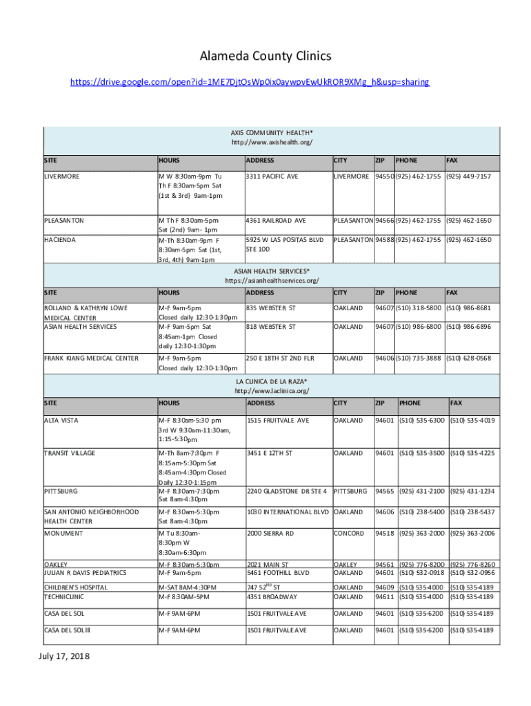Alameda County Clinics https://drive.google.com/open?id1ME7DjtOsWp0ix0aywpvEwUkROR9XMg_h&uspsharingAXIS COMMUNITY HEALTH* http://www.axishealth.org/ SITEHOURSADDRESSCITYLIVERMOREM W 8:30am9pm Tu Th F 8:30am5pm Sat (1st & 3rd) 9am1pm3311 PACIFIC AVELIVERMORE 94550 (925) 4621755 (925) 4497157PLEASANTONM Th F 8:30am5pm Sat (2nd) 9am 1pm MTh 8:30am9pm F 8:30am5pm Sat (1st, 3rd, 4th) 9am1pm4361 RAILROAD AVEPLEASANTON 94566 (925) 4621755 (925)