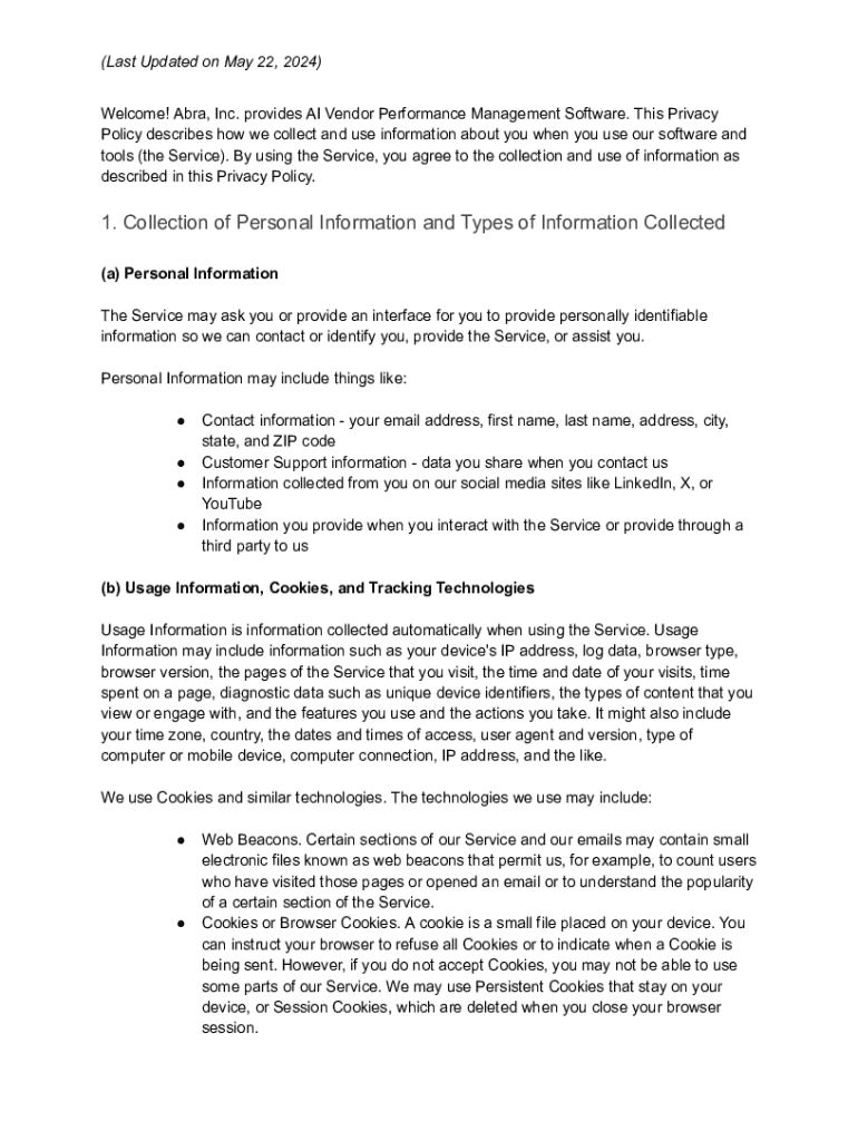 (Last Updated on May 22, 2024) Welcome! Abra, Inc. provides AI Vendor Performance Management Software. This Privacy Policy describes how we collect and use information about you when you use our software and tools (the Service). By using the Service, you agree to the collection and use of information as described in this Privacy Policy.1. Collection of Personal Information and Types of Information Collected (a) Personal Information The Service may ask you or provide an interface for you to...