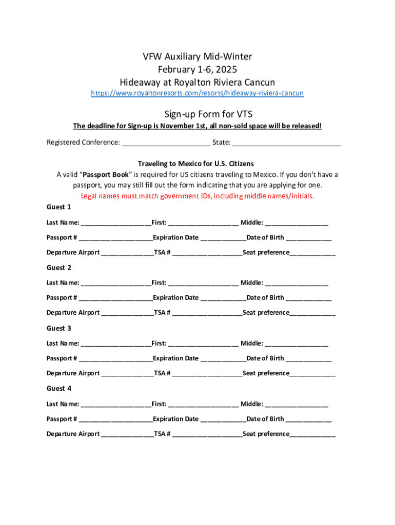 Este formulario es para inscribirse en la conferencia de VFW Auxiliary Mid-Winter que se llevará a cabo del 1 al 6 de febrero de 2025 en Hideaway at Royalton Riviera Cancun. El formulario incluye detalles sobre los huéspedes, información de pasaporte, preferencias de habitación y opciones de pago.