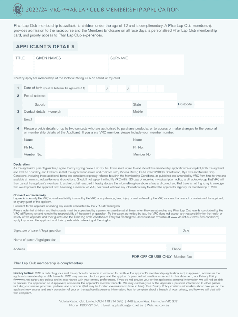 Application forms for the VRC Phar Lap Club usually require reporting personal information, payment details, and preferences for club communications and activities.