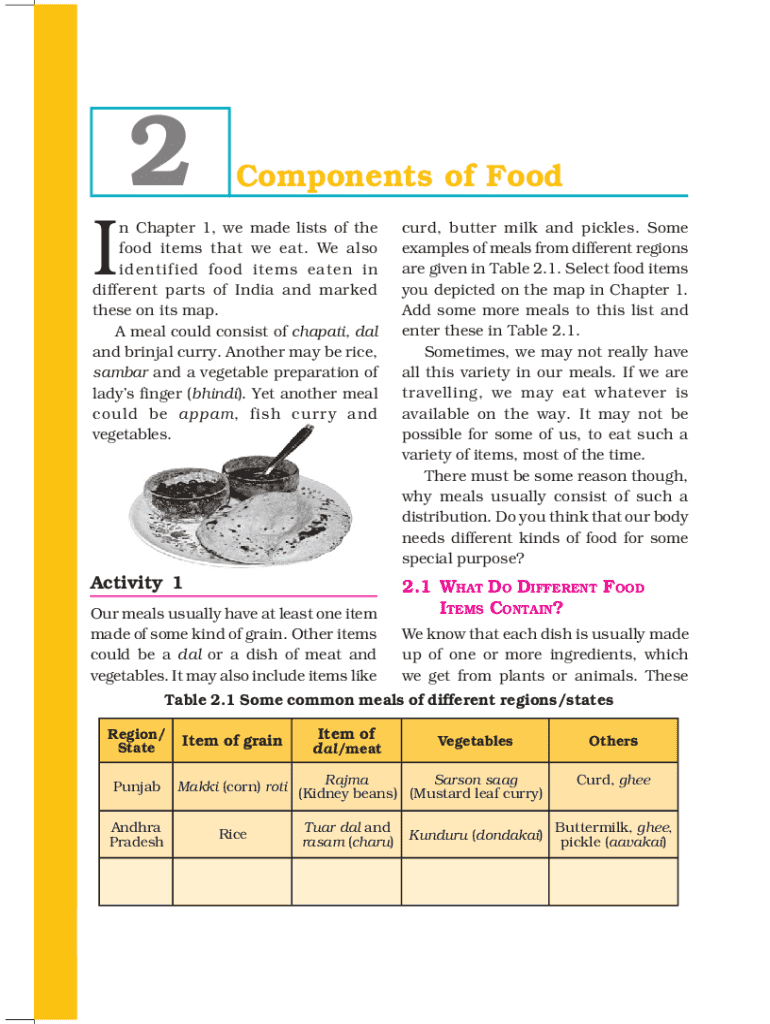 2Components of Foodn Chapter 1, we made lists of the food items that we eat. We also identified food items eaten in different parts of India and marked these on its map. A meal could consist of chapati,