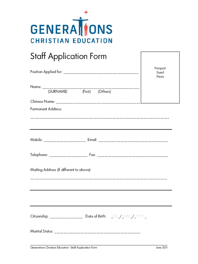This form is used for applying for a position at Generations Christian Education, collecting personal details, education history, work experience, and other relevant information.
