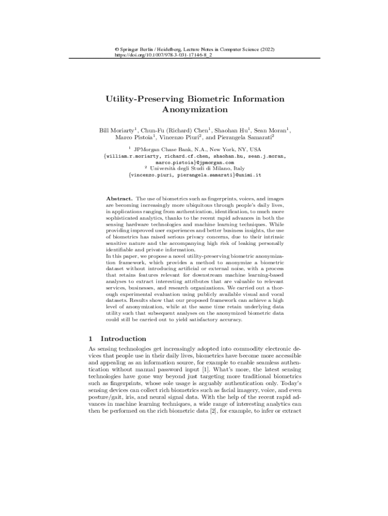 Springer Berlin / Heidelberg, Lecture Notes in Computer Science (2022) https://doi.org/10.1007/9783031171468_2UtilityPreserving Biometric Information Anonymization Bill Moriarty1 , ChunFu (Richard)