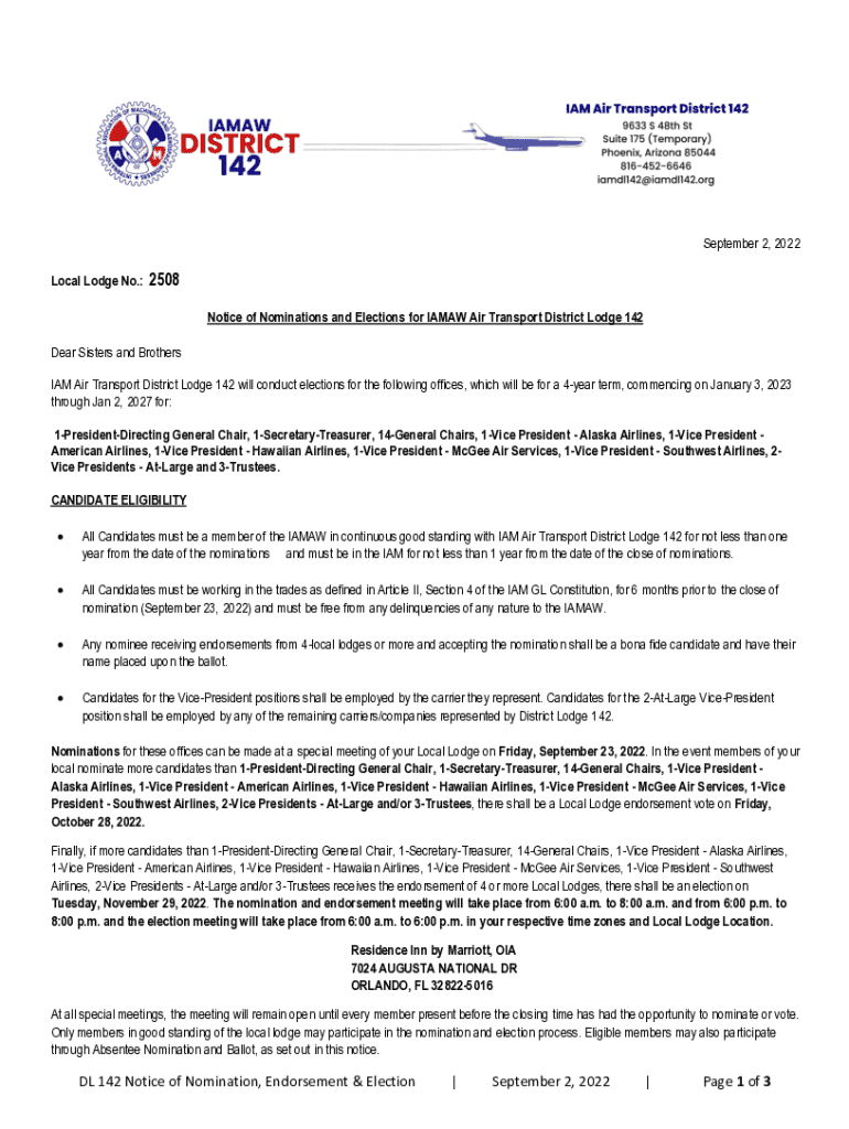 September 2, 2022 Local Lodge No.: 2508 Notice of Nominations and Elections for IAMAW Air Transport District Lodge 142 Dear Sisters and Brothers IAM Air Transport District Lodge 142 will conduct elections for the following offices, which will be for a 4year term, commencing on January 3, 2023 through Jan 2, 2027 for: 1PresidentDirecting General Chair, 1SecretaryTreasurer, 14General Chairs, 1Vice President Alaska Airlines, 1Vice President American Airlines, 1Vice President Hawaiian Airlines,