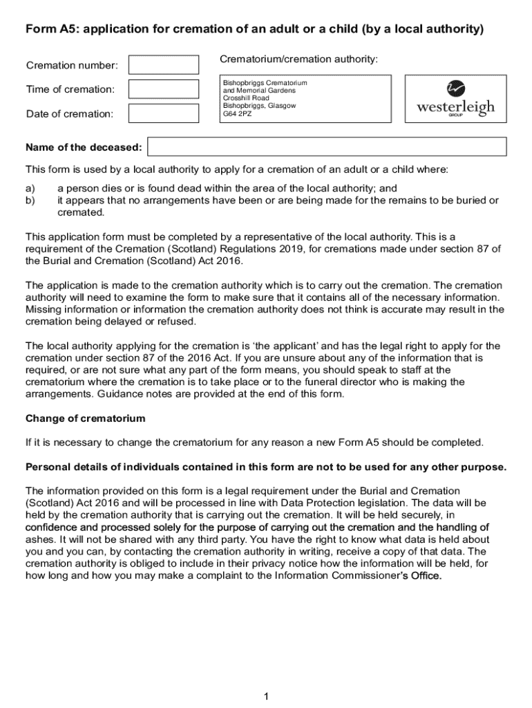 This form is used by a local authority to apply for the cremation of an adult or a child, particularly when a person dies or is found dead within the authority\'s area and no arrangements have been
