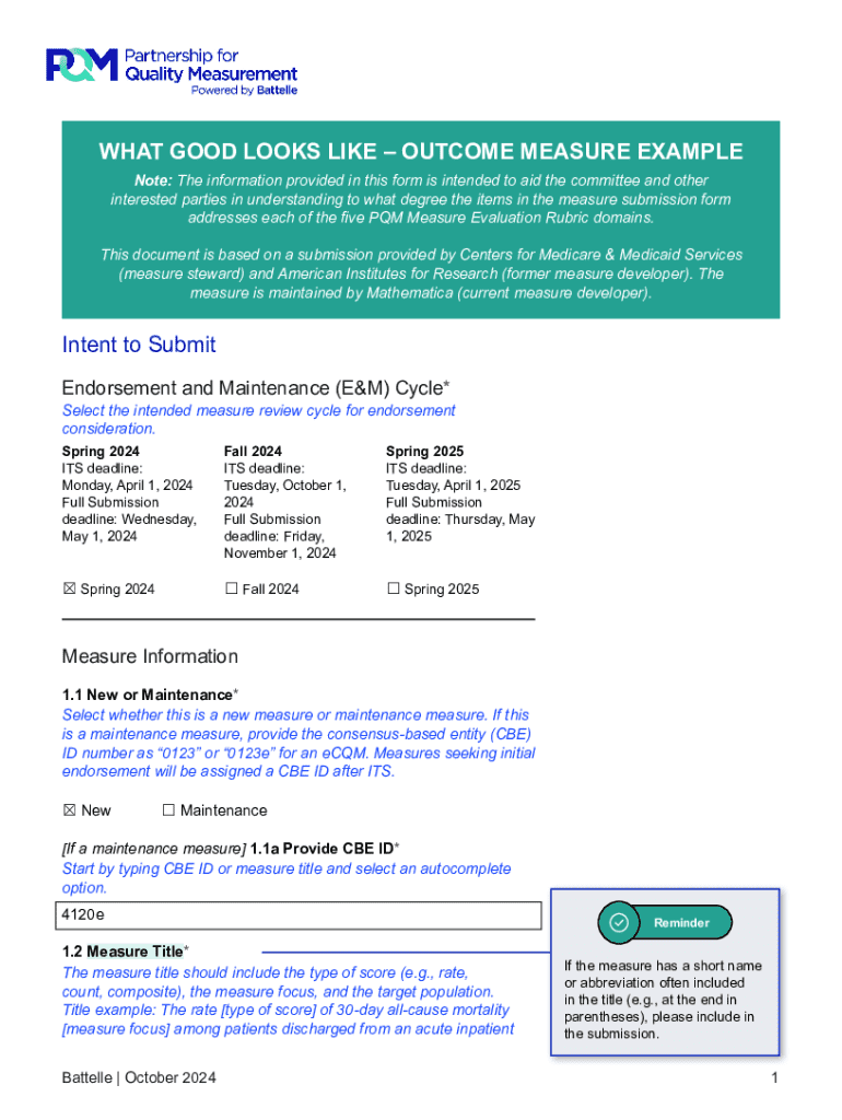 This document provides a comprehensive example of an outcome measure related to hospital harm, specifically focusing on falls with major and moderate injuries. It outlines the measure\'s intent, submission deadlines, descriptions, project alignment, testing methodologies, risk adjustment model, and equity considerations. It also discusses the importance of the measure in improving patient safety and quality of care within hospitals.