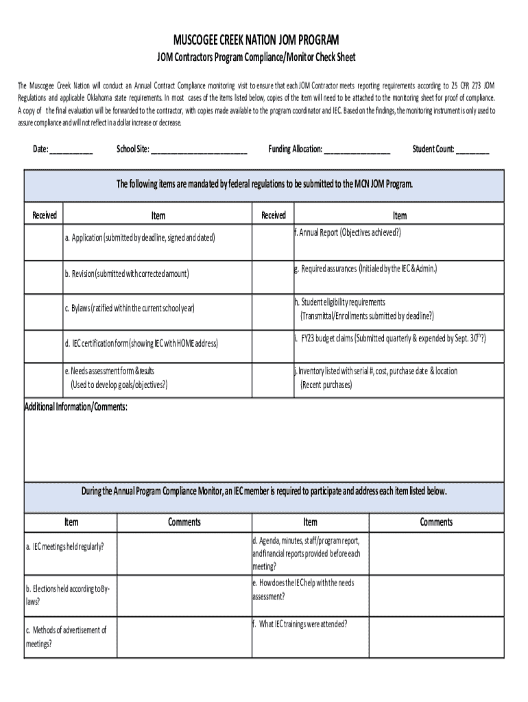 This document outlines the compliance monitoring requirements for JOM Contractors under the Muscogee Creek Nation\'s JOM Program, including necessary documentation and evaluation criteria mandated