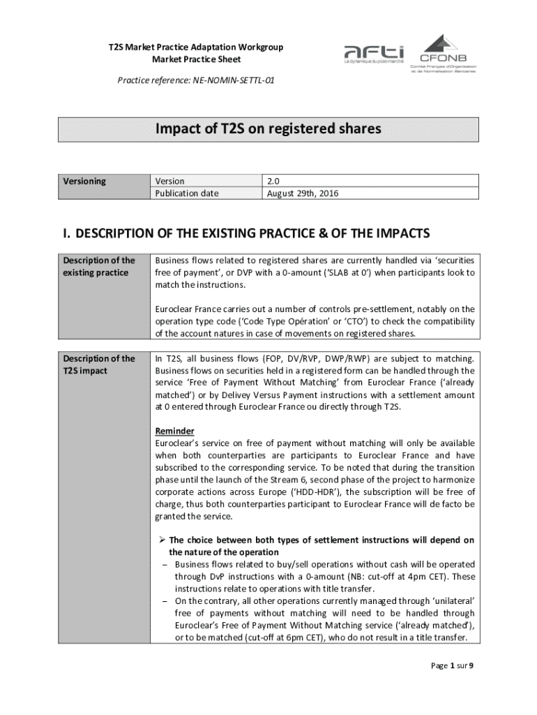 T2S Market Practice Adaptation Workgroup Market Practice Sheet Practice reference: NENOMINSETTL01Impact of T2S on registered shares VersioningVersion Publication date2.0 August 29th, 2016I. DESCRIPTION
