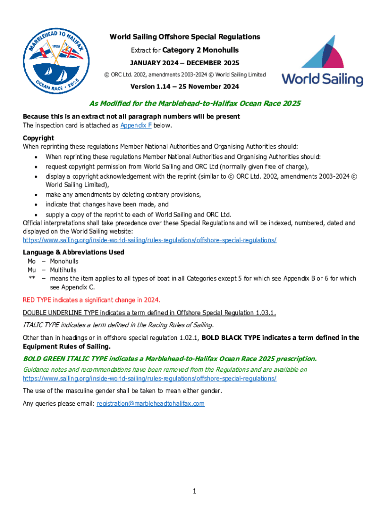 World Sailing Offshore Special Regulations Extract for Category 2 Monohulls JANUARY 2024 DECEMBER 2025 ORC Ltd. 2002, amendments 20032024 World Sailing LimitedVersion 1.14 25 November 2024As Modified