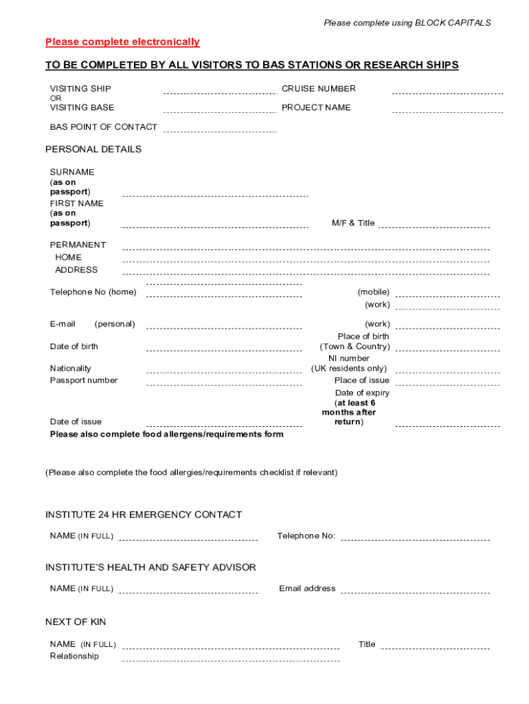Please complete using BLOCK CAPITALSPlease complete electronically TO BE COMPLETED BY ALL VISITORS TO BAS STATIONS OR RESEARCH SHIPS VISITING SHIPCRUISE NUMBERORVISITING BASEPROJECT NAMEBAS POINT OF CONTACTPERSONAL DETAILS SURNAME (as on passport) FIRST NAME (as on passport)M/F & TitlePERMANENT HOME ADDRESS Telephone No (home)Email(mobile) (work)(personal)(work)Date of birth Nationality Passport numberDate of issue Please also complete food allergens/requirements formPlace