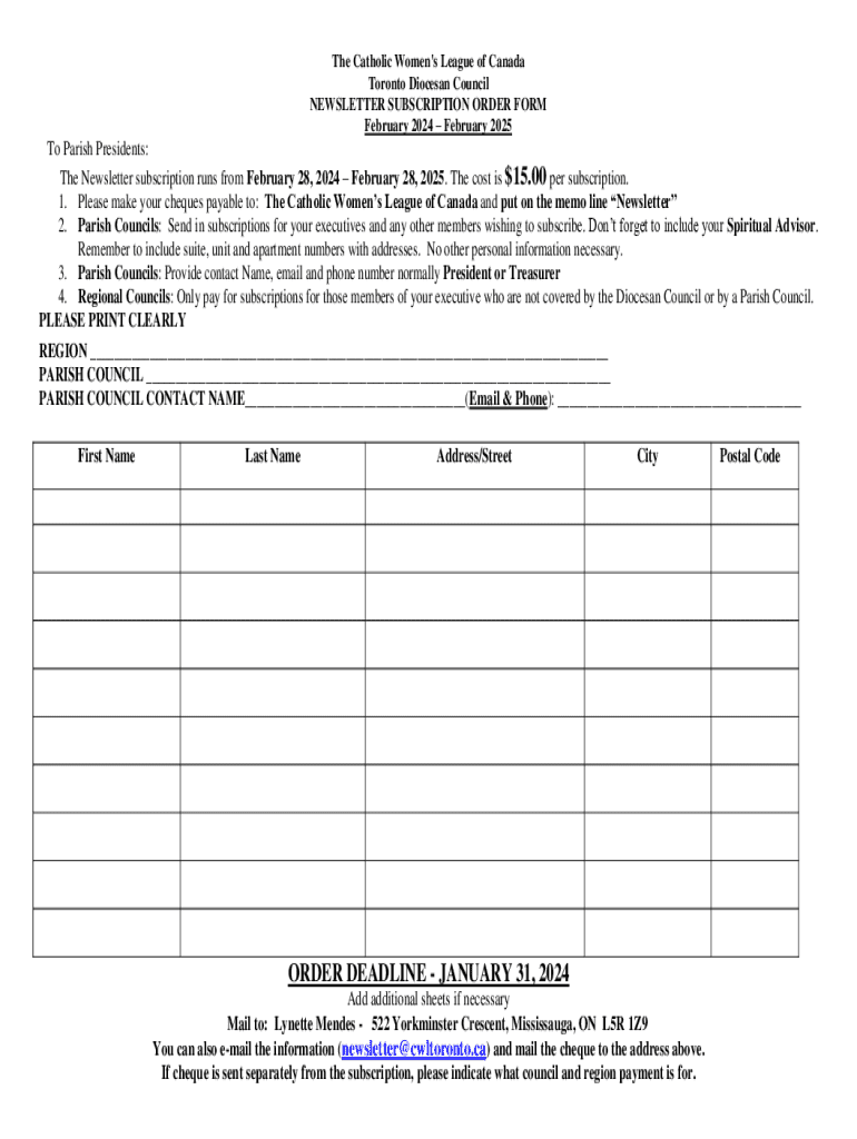 This form is for subscribing to the Catholic Women’s League of Canada newsletter for the period from February 28, 2024, to February 28, 2025, at a cost of $15.00 per subscription. It includes instructions for payment and contact information requirements for parish councils.