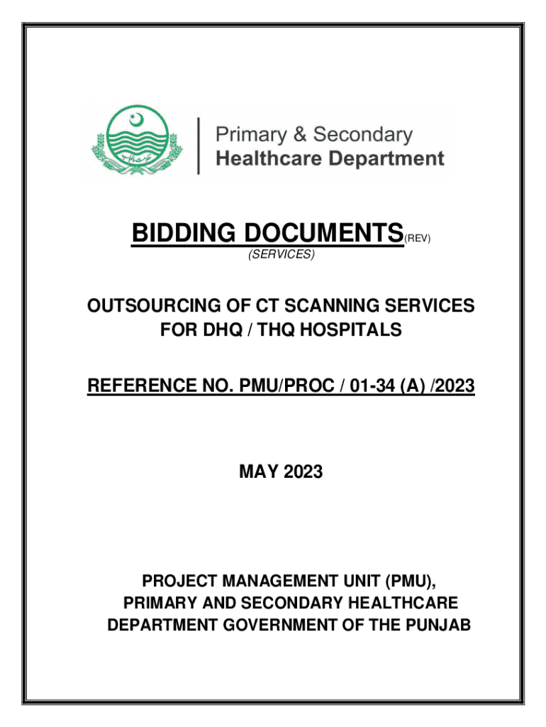 This document outlines the bidding process, criteria, requirements, and guidelines for outsourcing CT scanning services for designated hospitals under the Primary and Secondary Healthcare Department