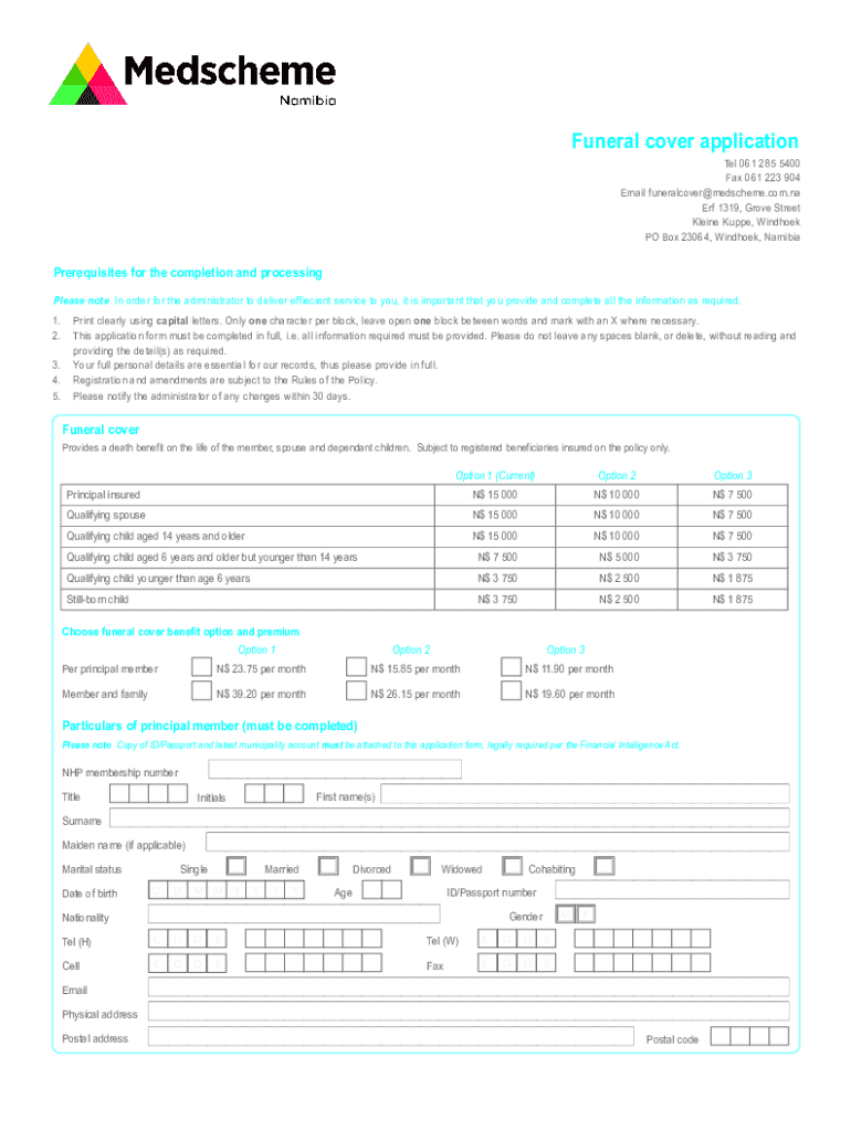 An application form for funeral cover providing various benefit options for members, spouses, and dependant children, requiring detailed personal and banking information along with necessary documentation.
