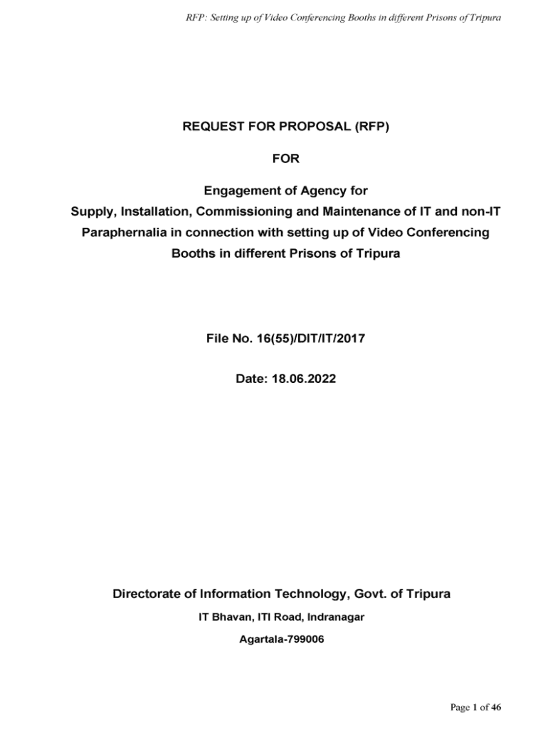 This document outlines the Request for Proposal (RFP) for the engagement of an agency to supply, install, commission, and maintain IT and non-IT paraphernalia related to the setup of Video Conferencing Booths in various prisons across the State of Tripura. It includes detailed specifications, eligibility criteria, and timelines for the project.