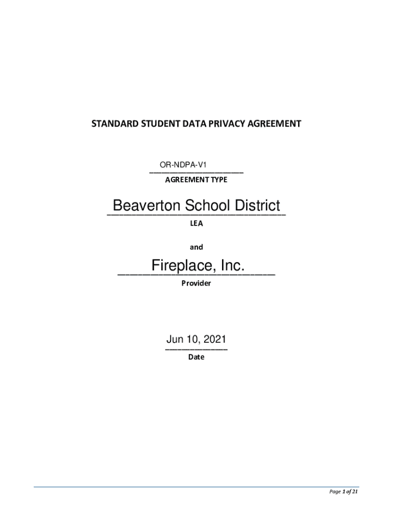 This Student Data Privacy Agreement (DPA) establishes the obligations of Beaverton School District (LEA) and Fireplace, Inc. (Provider) in order to protect student data and comply with applicable privacy laws, including FERPA and COPPA. It outlines data ownership, authorized access, duties of both parties, data security requirements, and the process for handling data breaches.