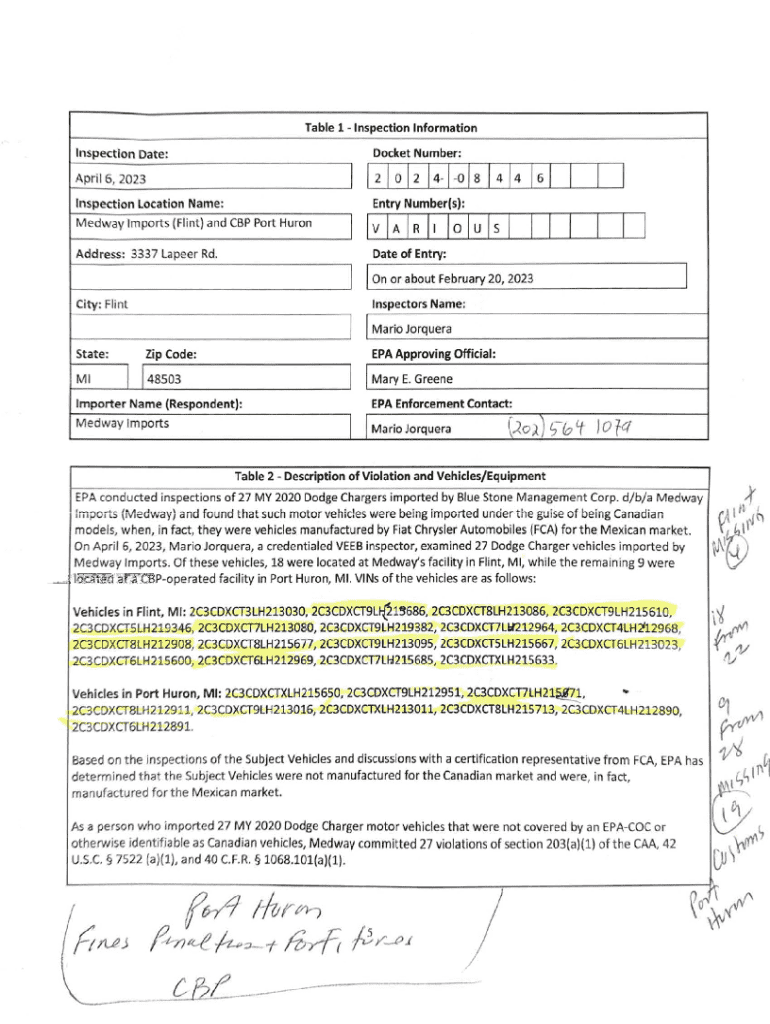 Table 1 Inspection Information Docket Number:Inspection Date:IApril 6, 2023I 2 Io I2 I4 IoI8 I4 I4I6 IIIIIIIIEntry Number(s):Inspection Location Name: Medway Impo rts (Flint) and CBP Port HuronII V I A I R I I Io I u Is IIIDate of Entry:Address: 3337 Lapeer Rd.I IOn or about February 20, 2023IInspectors Name:City: FlintI IMario Jorquera State:MlEPA Approving Official:Zip Code:I IMary E. GreeneI 148503EPA Enforcement Contact:Importer