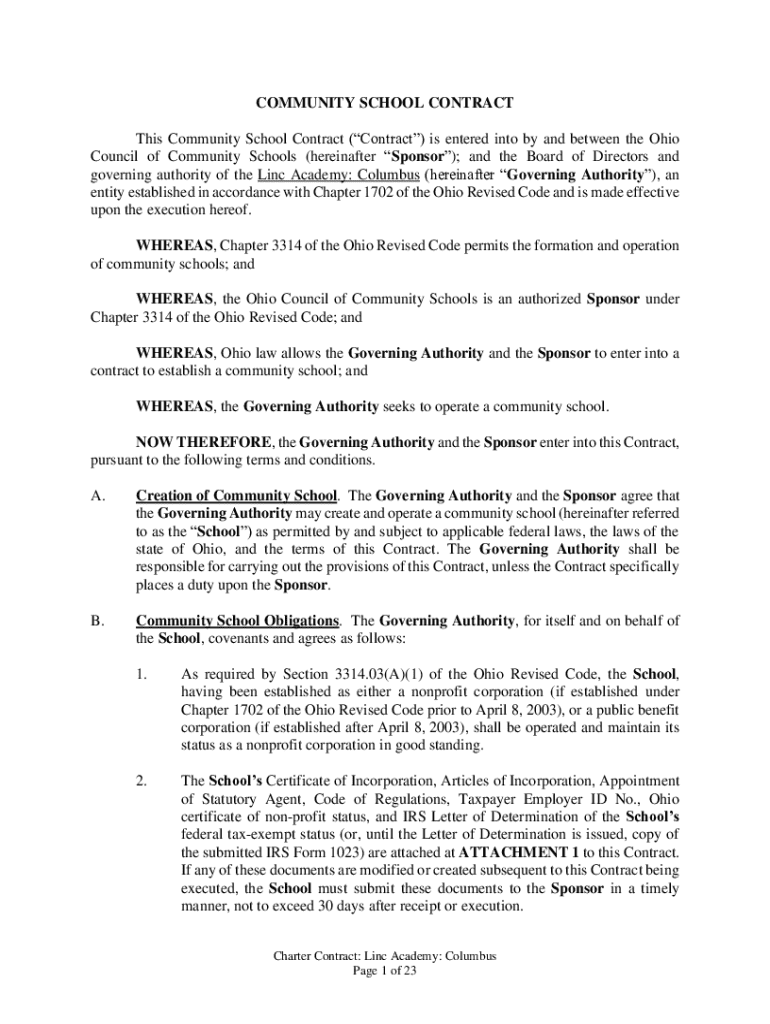 This Community School Contract establishes the operational framework between the Ohio Council of Community Schools and Linc Academy: Columbus, detailing the responsibilities, obligations, and governance structure for the establishment and management of the school according to Ohio law.
