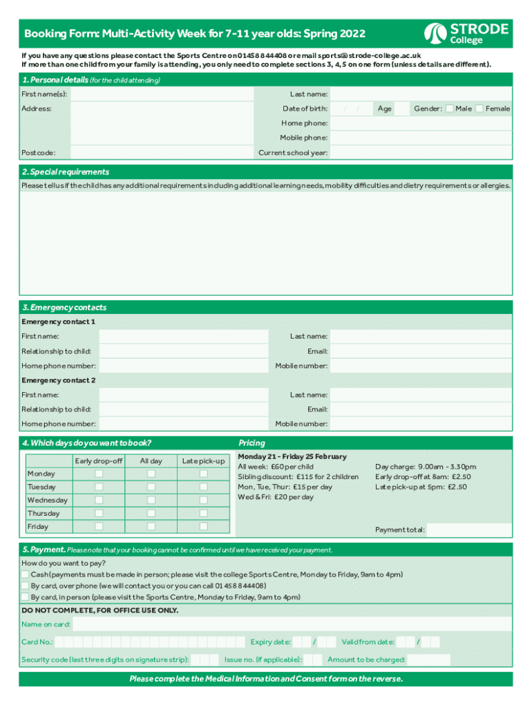 This form is used to book a multi-activity week for children aged 7-11, providing details about the child\'s personal information, special requirements, emergency contacts, and payment information. It also includes medical information and consent for participation in activities at Strode College.