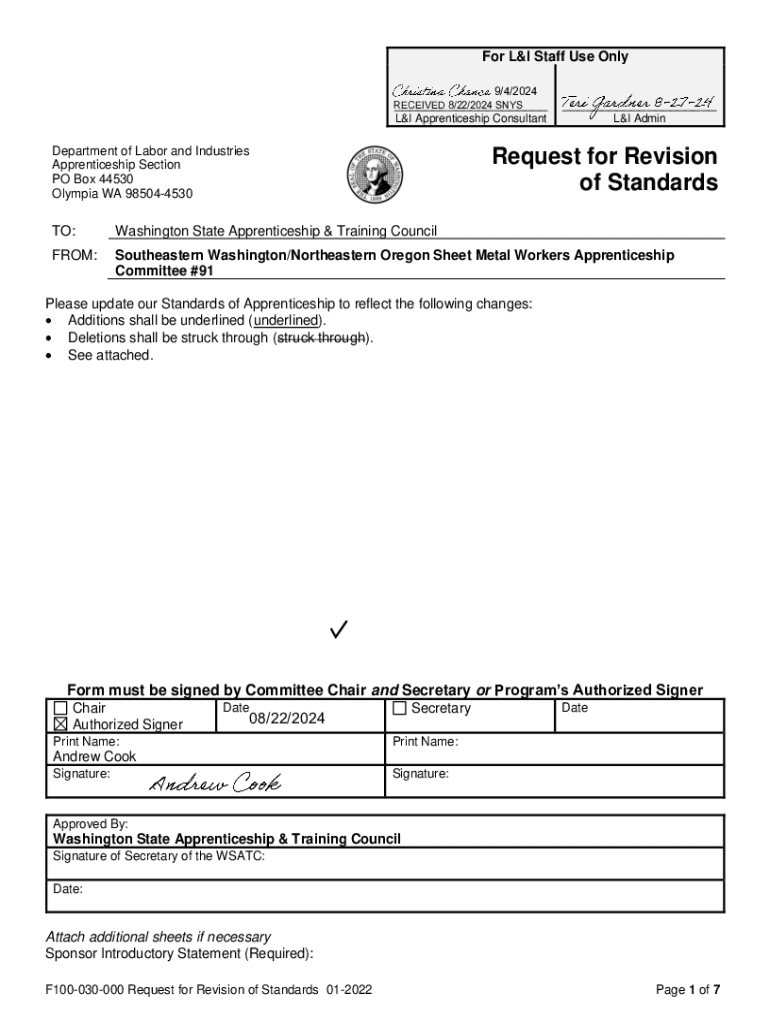 Este documento es una solicitud de revisión de los estándares de aprendizaje para el desarrollo de aprendices en la industria de la hojalatería por parte del Comité de Aprendizaje y Capacitación de los Trabajadores de Hoja de Suroeste de Washington / Noreste de Oregón. Contiene requisitos de calificación mínima, procedimientos de selección y escalas salariales para los aprendices.