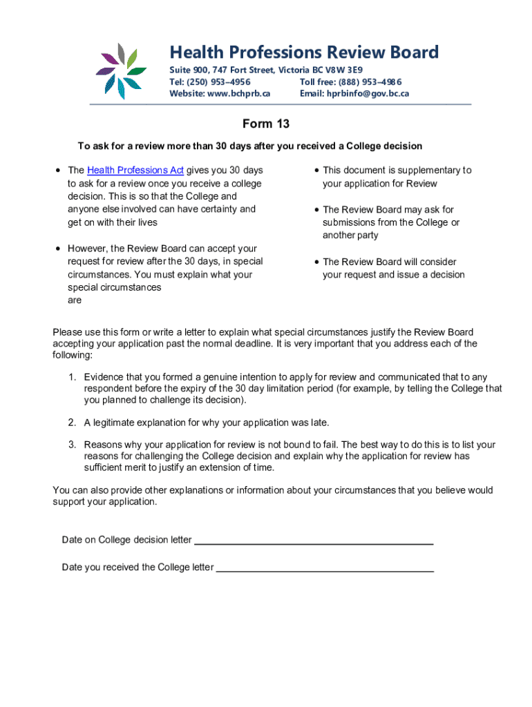 Este formulario es para solicitar una revisión más de 30 días después de haber recibido una decisión de un colegio. El documento explica los criterios especiales que deben presentarse para que