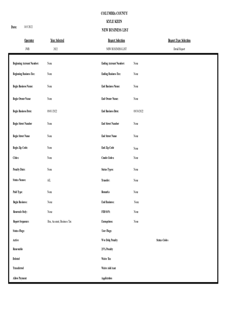 This document includes a detailed list of new businesses registered in Columbia County for the year 2022. It contains information such as business names, owners, addresses, business tax receipts, payment dates, and amounts due or paid.