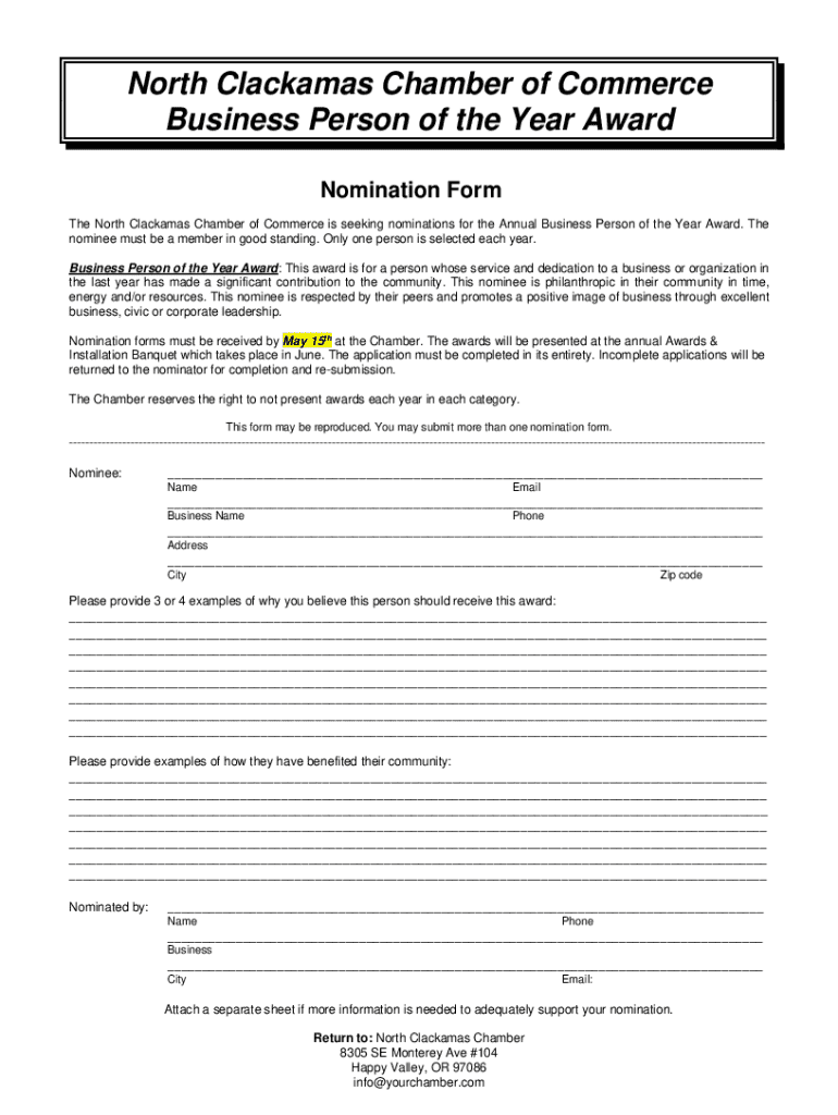 Este formulario busca nominaciones para el Premio a la Persona del Año en el ámbito empresarial, otorgado por la Cámara de Comercio de North Clackamas. Se busca un nominado que sea miembro en buen estado y que haya hecho contribuciones significativas a la comunidad a través de su servicio, dedicación y liderazgo.
