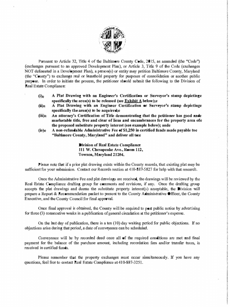 Pursuant to Article 32, Title 4 of the Baltimore County Code, 2015, as amended (the \"Code\") (exchanges pursuant to an approved Development Plan), or Article 3, Title 9 of the Code (exchanges NOT delineated in a Development Plan), a person(s) or entity may petition Baltimore County, Maryland (the \"County\") to exchange real or leasehold property for purposes of consolidation or another public purpose. In order to initiate the process, the petitioner should submit the following to the...