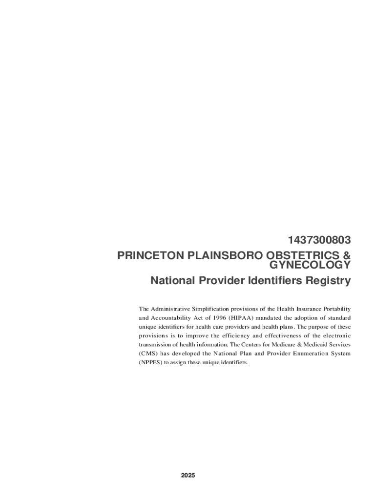 1437300803 PRINCETON PLAINSBORO OBSTETRICS & GYNECOLOGY National Provider Identifiers Registry The Administrative Simplification provisions of the Health Insurance Portability and Accountability Act