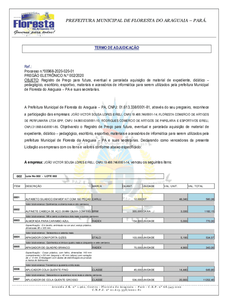 PREFEITURA MUNICIPAL DE FLORESTA DO ARAGUAIA PAR.___ TERMO DE ADJUDICAORef.: Processo n.00968202002001 PREGO ELETRNICO N. 002/2020 OBJETO: Registro de Preo para futura, eventual e parcelada aquisio de material de expediente, didtico pedaggico, escritrio, esportivo, materiais e acessrios de informtica para serem utilizados pela prefeitura Municipal de Floresta do Araguaia PA e suas secretarias.A Prefeitura Municipal de Floresta do Araguaia PA, CNPJ: 01