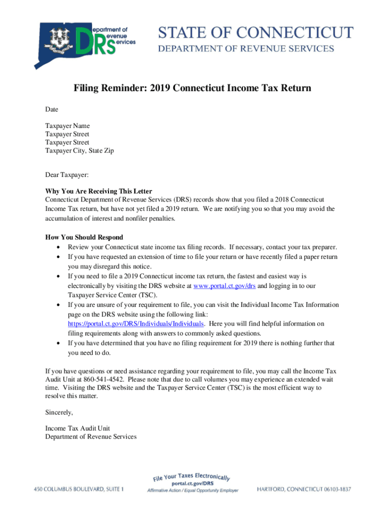 Filing Reminder: 2019 Connecticut Income Tax Return Date Taxpayer Name Taxpayer Street Taxpayer Street Taxpayer City, State ZipDear Taxpayer: Why You Are Receiving This Letter Connecticut Department of Revenue Services (DRS) records show that you filed a 2018 Connecticut Income Tax return, but have not yet filed a 2019 return. We are notifying you so that you may avoid the accumulation of interest and nonfiler penalties. How You Should Respond Review your Connecticut state income tax filing...