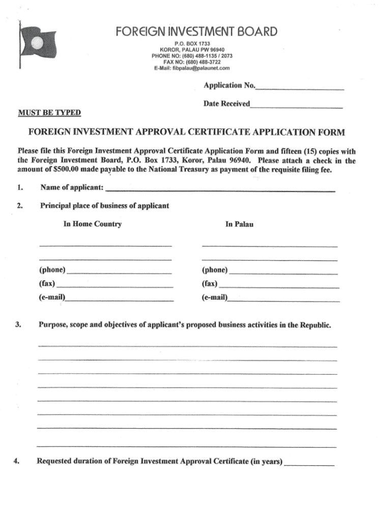 This form is to apply for a Foreign Investment Approval Certificate in the Republic of Palau. It requires detailed information about the applicant, their business, proposed activities, and financial