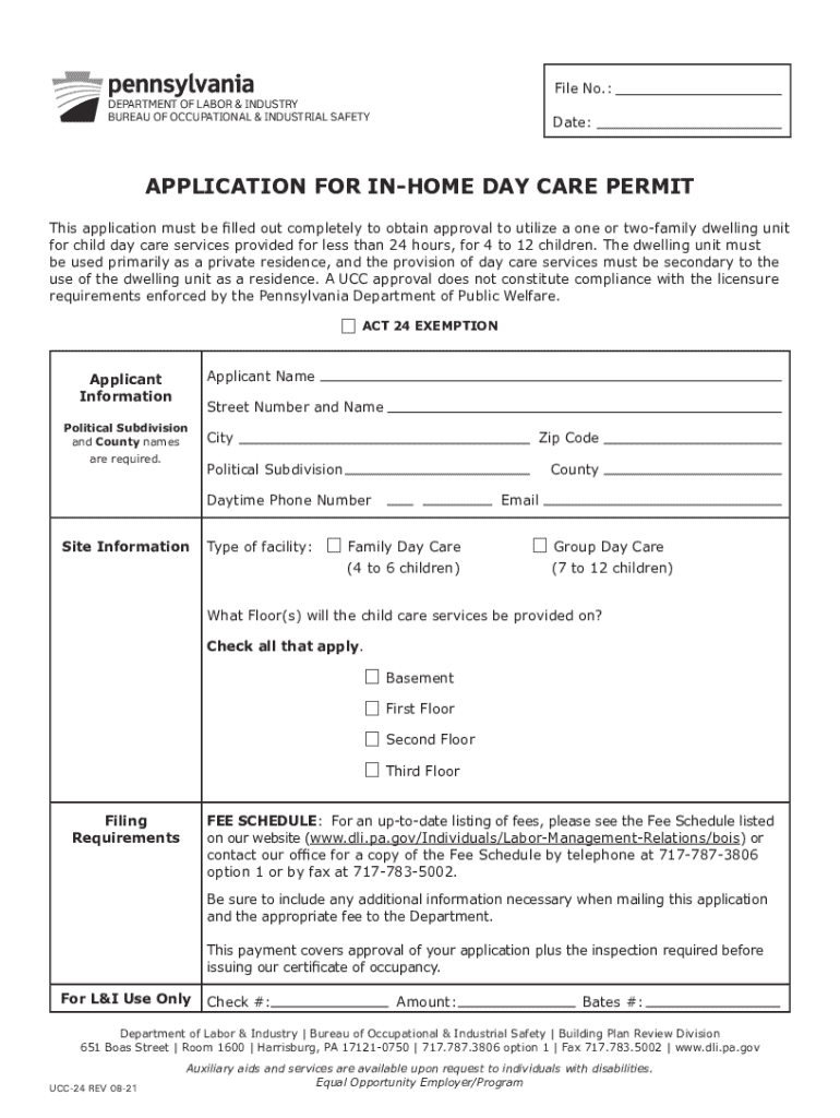 This application must be filled out completely to obtain approval to utilize a one or two-family dwelling unit for child day care services provided for less than 24 hours, for 4 to 12 children. A