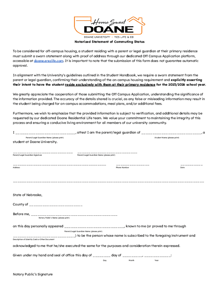 This document is required for students applying for off-campus housing at Doane University. It must be submitted by a parent or legal guardian, confirming their understanding of the housing requirements and the student\'s intention to reside exclusively with them for the 2025/2026 school year. The accuracy of the submitted information is crucial for the application process.