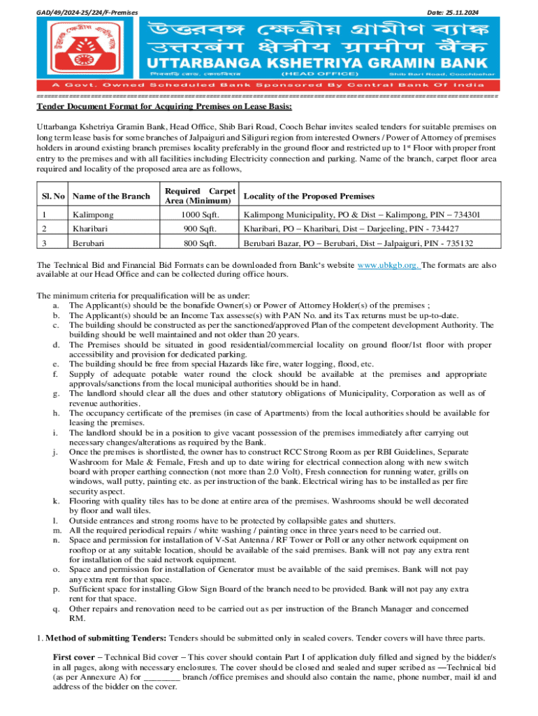GAD/49/202425/224/FPremisesDate: 25.11.2024Tender Document Format for Acquiring Premises on Lease Basis: Uttarbanga Kshetriya Gramin Bank, Head Office, Shib Bari Road, Cooch Behar invites sealed tenders for suitable premises on long term lease basis for some branches of Jalpaiguri and Siliguri region from interested Owners / Power of Attorney of premises holders