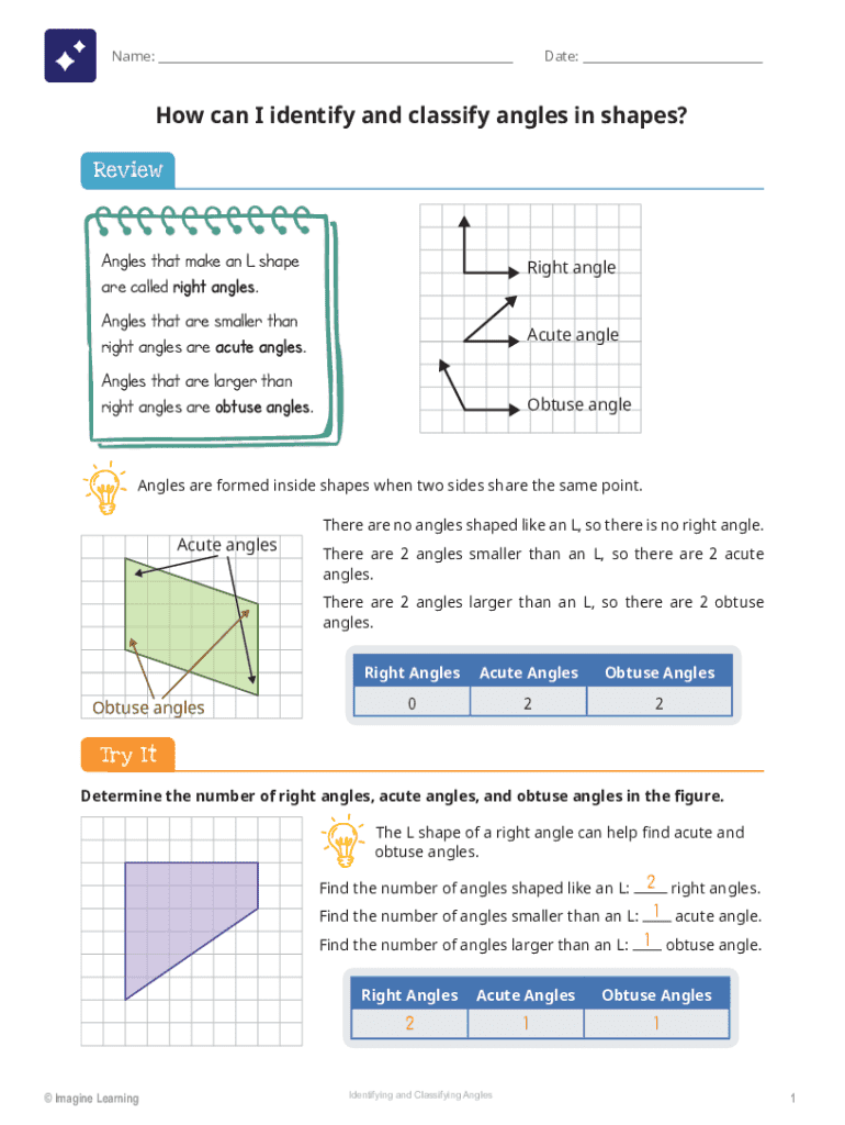 Name: ___Date: ___How can I identify and classify angles in shapes? ReviewAngles that make an L shape are called right angles.Right angleAngles that are smaller than right angles are acute angles.Acute angleAngles that are larger than right angles are obtuse angles.Obtuse angleAngles are formed inside shapes when two sides share the same point.Acute anglesThere are no angles shaped like an L, so there is no right angle. There are 2 angles smaller than an L, so there are 2 acute angles