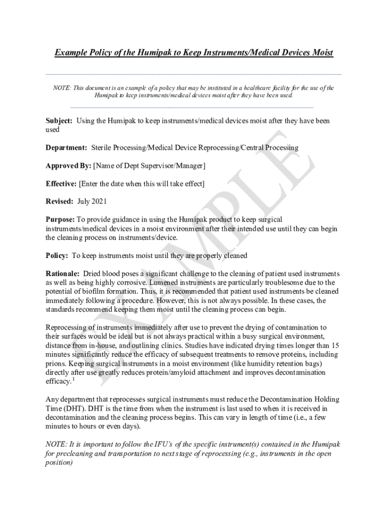 Example Policy of the Humipak to Keep Instruments/Medical Devices Moist ___ NOTE: This document is an example of a policy that may be instituted in a healthcare facility for the use of the Humipak to keep instruments/medical devices moist after they have been used.___ Subject: Using the Humipak to keep instruments/medical devices moist after they have been used Department: Sterile Processing/Medical Device Reprocessing/Central Processing Approved By: [Name of Dept Supervisor/Manager] Effective: