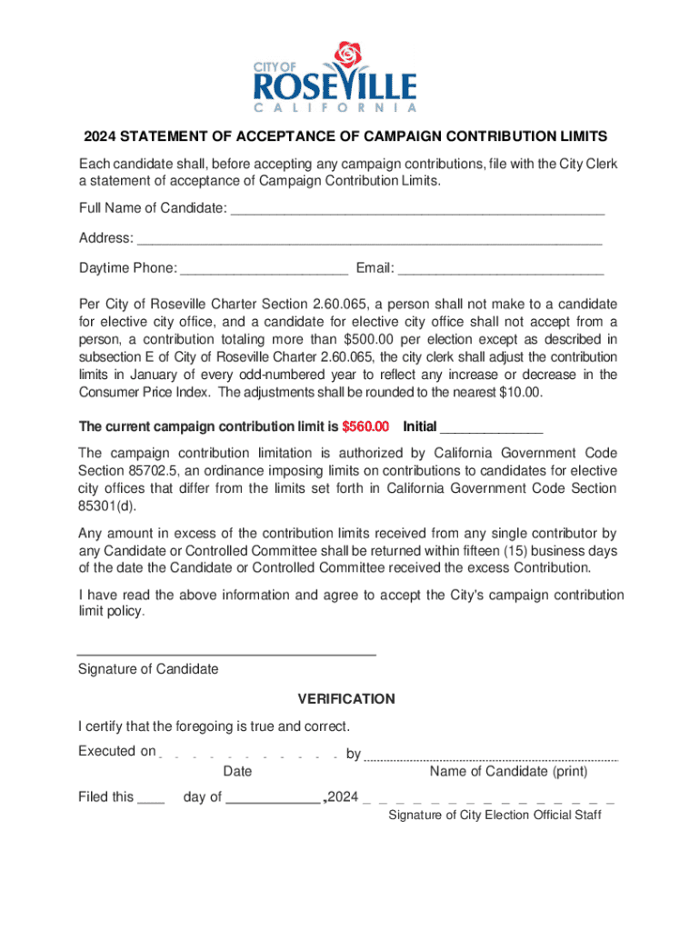 2024 STATEMENT OF ACCEPTANCE OF CAMPAIGN CONTRIBUTION LIMITS Each candidate shall, before accepting any campaign contributions, file with the City Clerk a statement of acceptance of Campaign Contribution Limits. Full Name of Candidate: ___ Address: ___ Daytime Phone: ___ Email: ___ Per City of Roseville Charter Section 2.60.065, a person shall not make to a candidate for elective city office, and a candidate for elective city office shall not accept from a person, a contribution totaling more...