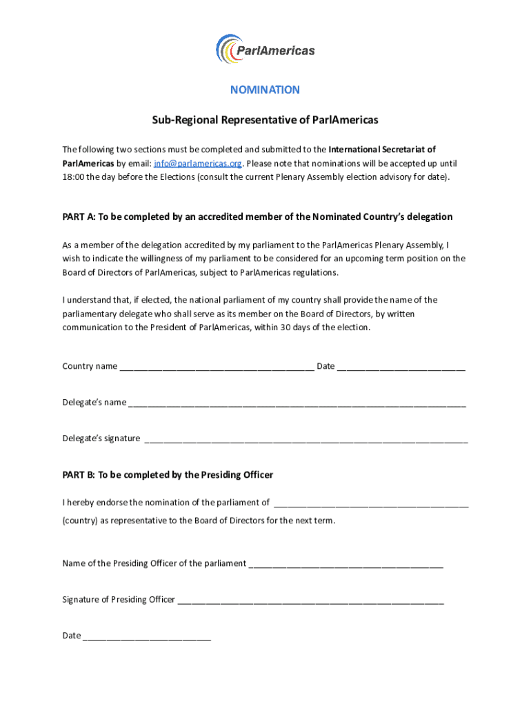 This document is a nomination form for the Sub-Regional Representative of ParlAmericas, requiring completion by an accredited member of the delegation and endorsement by the Presiding Officer of the parliament.
