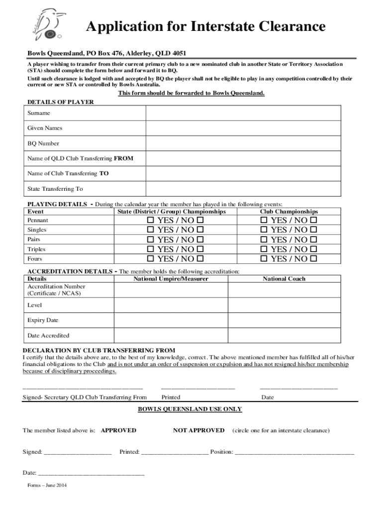 This form is to be completed by players wishing to transfer from their current primary club to a new nominated club in another State or Territory Association (STA). It must be lodged with Bowls Queensland to be eligible to play in competitions controlled by the previous or new STA.