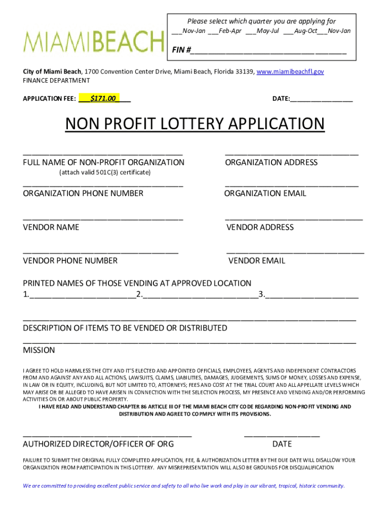 This application is for non-profit organizations wishing to participate in the lottery for vending opportunities in Miami Beach. Applicants must provide their organization\'s information, mission, and agree to hold the city harmless. The application requires a fee and adherence to specific city codes.