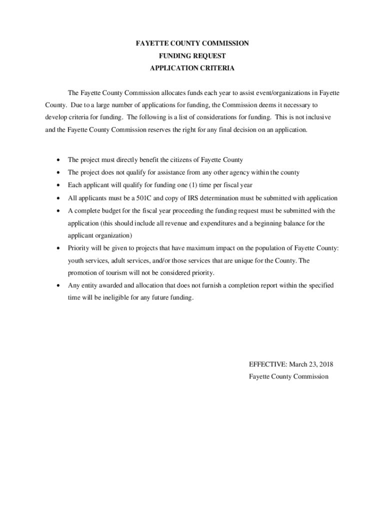 This document outlines the criteria and application process for organizations seeking funding from the Fayette County Commission. It includes requirements such as eligibility, necessary documentation, and the reporting process for allocated funds.