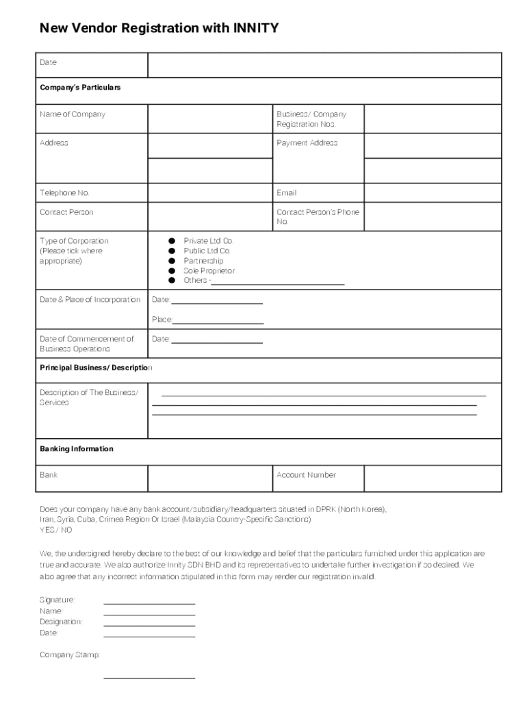 This form is intended for the registration of new vendors with INNITY. It includes sections for company particulars, banking information, conflict of interest declaration, and adherence to INNITY\'s Code of Conduct.