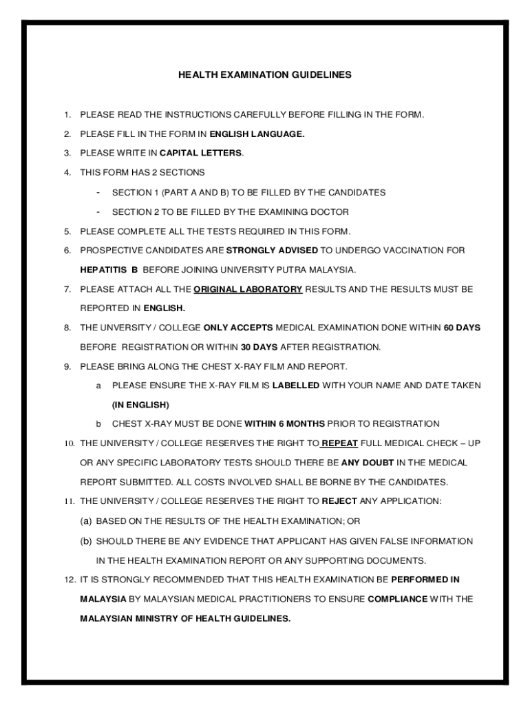This document provides guidelines for the health examination required for prospective candidates at Universiti Putra Malaysia. It outlines instructions for completing the health examination form,