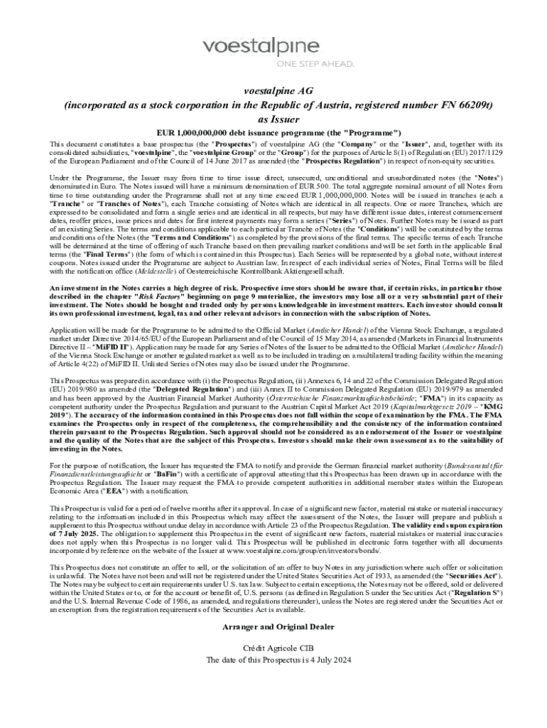 voestalpine AG (incorporated as a stock corporation in the Republic of Austria, registered number FN 66209t) as Issuer EUR 1,000,000,000 debt issuance programme (the \"Programme\") This document constitutes a base prospectus (the \"Prospectus\") of voestalpine AG (the \"Company\" or the \"Issuer\", and, together with its consolidated subsidiaries, \"voestalpine\", the \"voestalpine Group\" or the \"Group\") for the purposes of Article 8(1) of Regulation (EU) 2017/1129 of the European...