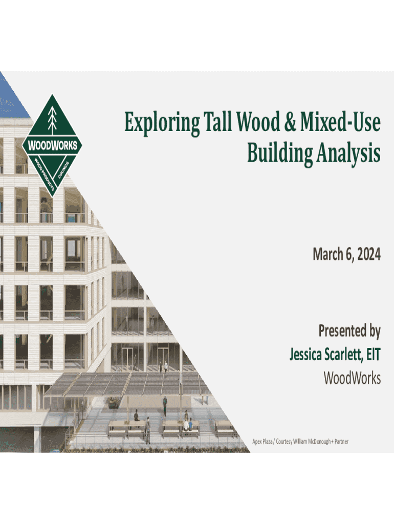 Exploring Tall Wood & MixedUse Building AnalysisMarch 6, 2024Presented by Jessica Scarlett, EIT WoodWorks Apex Plaza / Courtesy William McDonough + PartnerRegional Directors:OneonOne Project SupportSolutions