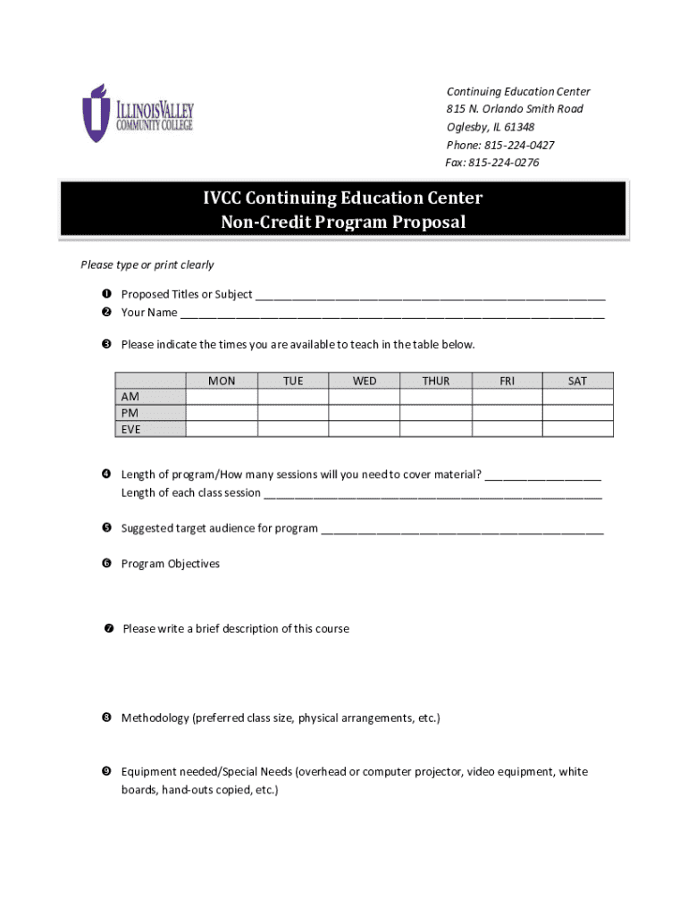 This document serves as a proposal form for non-credit educational programs offered by the IVCC Continuing Education Center, allowing individuals to submit program titles, descriptions, target audiences,