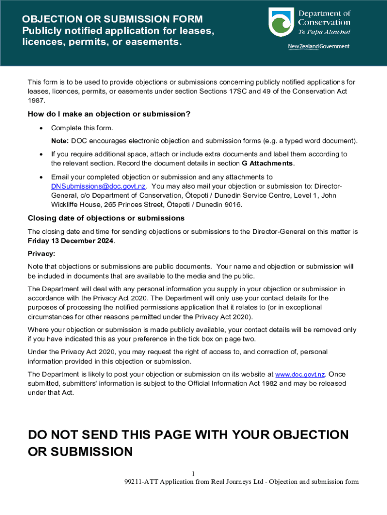 This form is to be used to provide objections or submissions concerning publicly notified applications for leases, licences, permits, or easements under sections 17SC and 49 of the Conservation Act 1987. It includes instructions on how to complete the form, submission methods, and privacy considerations.